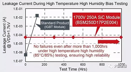 新型BSM250D17P2E004產(chǎn)品引入了一種新的封裝方法和涂層材料,以保護芯片免受介電擊穿,并抑制漏電流的增加,使模塊能夠通過HV-H3TRB可靠性測試。例如,在這種高壓、高溫、高濕度反向偏壓測試期間,當(dāng)在85°C和85%濕度下施加1360V超過1000小時時,器件沒有出現(xiàn)故障,不同于傳統(tǒng)IGBT模塊,通常在1000小時以內(nèi)因電介質(zhì)擊穿而導(dǎo)致失效。為確保最高水平的可靠性,ROHM以不同的間隔測試了模塊的漏電流,最高阻斷電壓為1700V。